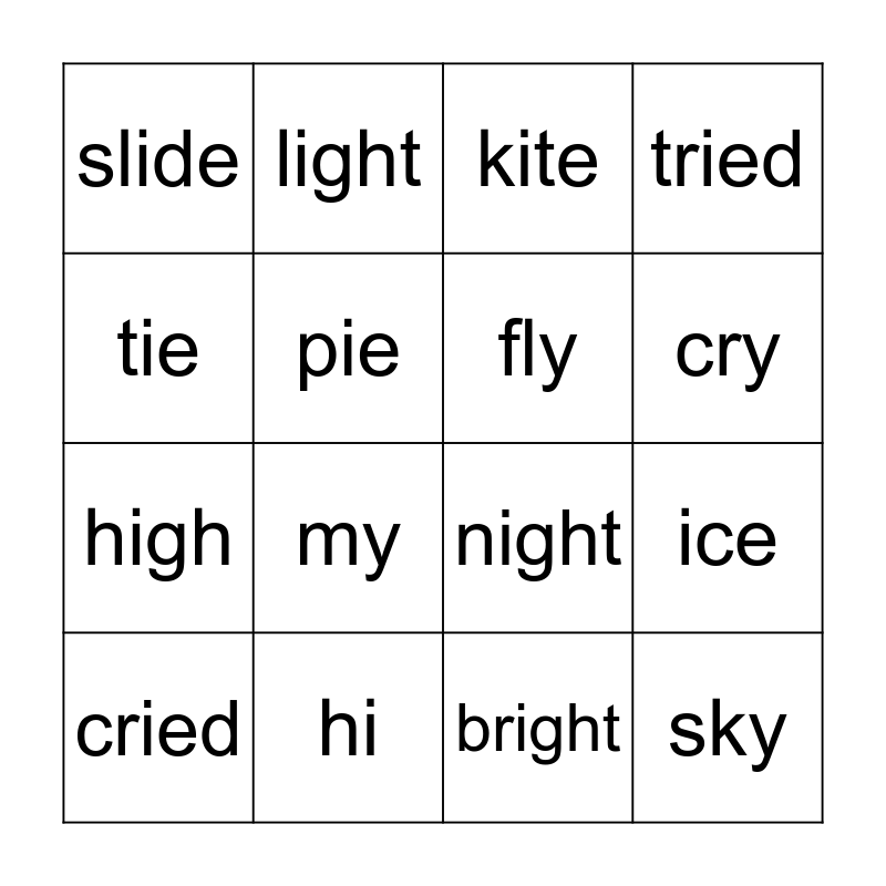 This bingo card has 16 words: hi, ice, kite, slide, high, light, night, bright, tie, pie, cried, tried, my, cry, fly and sky.