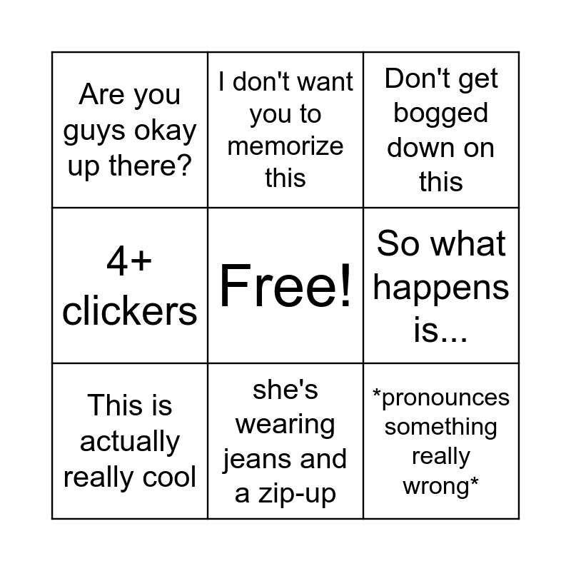 This bingo card has a free space and 8 words: So what happens is..., Don't get bogged down on this, I don't want you to memorize this, This is actually really cool, Are you guys okay up there?, *pronounces something really wrong*, 4+ clickers and she's wearing jeans and a zip-up.