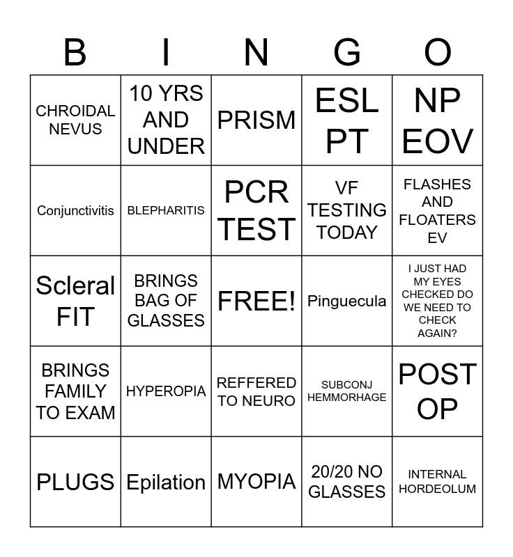 This bingo card has a free space and 24 words: HYPEROPIA, Epilation, PCR TEST, PLUGS, NP EOV, CHROIDAL NEVUS, Conjunctivitis, 10 YRS AND UNDER, Pinguecula, REFFERED TO NEURO, VF TESTING TODAY, Scleral FIT, SUBCONJ HEMMORHAGE, POST OP, BLEPHARITIS, 20/20 NO GLASSES, I JUST HAD MY EYES CHECKED DO WE NEED TO CHECK AGAIN?, PRISM, FLASHES AND FLOATERS EV, BRINGS BAG OF GLASSES, INTERNAL HORDEOLUM, BRINGS FAMILY TO EXAM, ESL PT and MYOPIA.