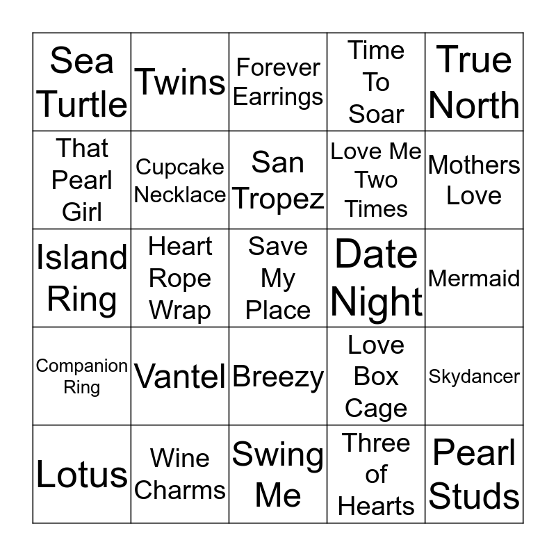 This bingo card has 25 words: Vantel, Swing Me, San Tropez, Lotus, True North, Sea Turtle, That Pearl Girl, Twins, Date Night, Breezy, Love Me Two Times, Island Ring, Love Box Cage, Skydancer, Cupcake Necklace, Pearl Studs, Mermaid, Forever Earrings, Mothers Love, Heart Rope Wrap, Save My Place, Wine Charms, Companion Ring, Time To Soar and Three of Hearts.