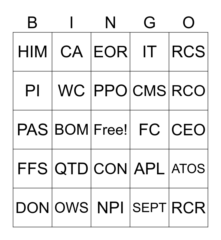 This bingo card has a free space and 146 words: Retrieving data. Wait a few seconds and try to cut or copy again., ADJ, ALM, AMA, AP, APL, AR, ART, ASC, ATB, ATOS, AUTH, ADJ, ALM, AMA, AP, APL, AR, ART, ASC, ATB, ATOS, AUTH, BAR, BCBS, BOM, CA, CB, CBO, CC, CDHP, CDM, CDO, CEO, CFO, CIF, CLT, CM, CMS, CMS 1500, COB, COINS, CON, CPT, CX, DED, DFO, DIBS, DO, DOB, DOI, DOL, DON, DOS, DX, EBITDA, ECS, EDI, EFT, EOB, EOR, EPO, ERA, ERISA, FAST, FC, FFS, FMLA, FO, G/L, GVP, HCPCS, HIM, HIPAA, HMO, HR, HST, ICD, INS, IT, IUH, IV, IVR, KPI, LMS, LOA, MC, MTD, NCCI, NPI, NPR, NTT, OON, OOP, OWS, PA, PACU, PART, PAS, PCD, PCP, PI, PO, POPP, POS, PPO, PPP, PPRT, PR, PTO, QA, QTD, RCM, RCO, RIG, RCR, RCS, ROI, RVP, RX, SCAH, SCALE, SCO, SE, SEPT, SNF, STAT, SVP, TA, TGS, THR, TOB, TRG, TSC, TX, UAR, UAV, UB-04, UBO, VA, VAL, WC, YOE, YOY, YTD and ZBA.