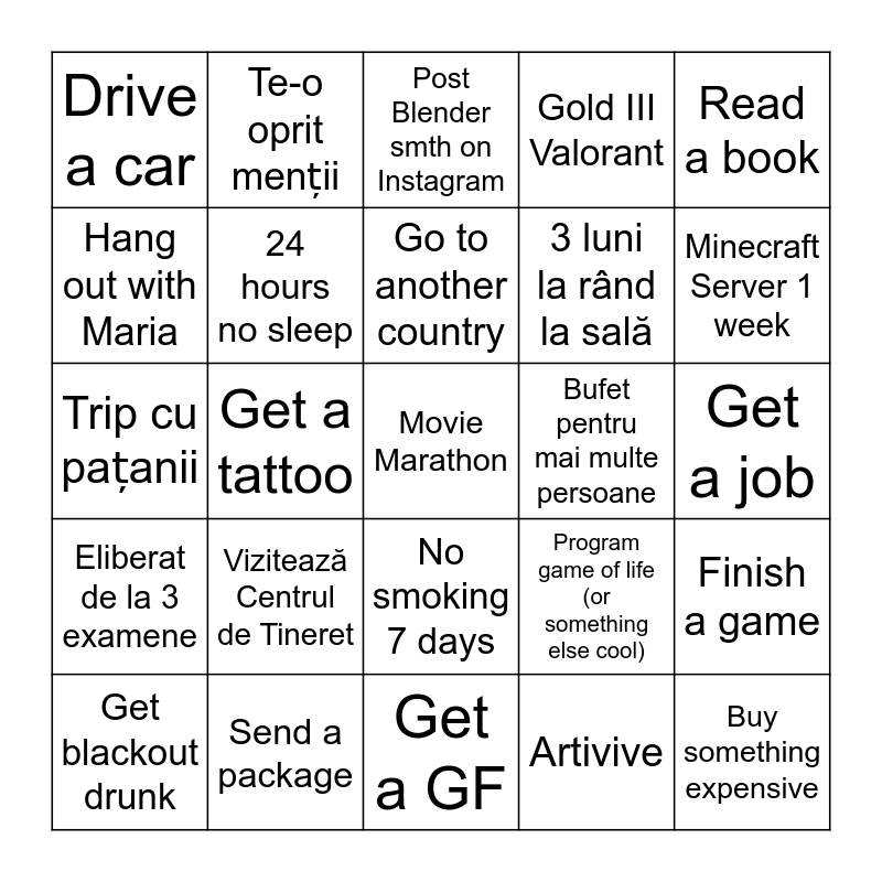 This bingo card has 25 words: Vizitează Centrul de Tineret, Get a GF, Go to another country, Get blackout drunk, Read a book, Drive a car, Hang out with Maria, Te-o oprit menții, Bufet pentru mai multe persoane, No smoking 7 days, 3 luni la rând la sală, Trip cu pațanii, Program game of life (or something else cool), Finish a game, 24 hours no sleep, Buy something expensive, Get a job, Post Blender smth on Instagram, Minecraft Server 1 week, Get a tattoo, Movie Marathon, Send a package, Eliberat de la 3 examene, Gold III Valorant and Artivive.