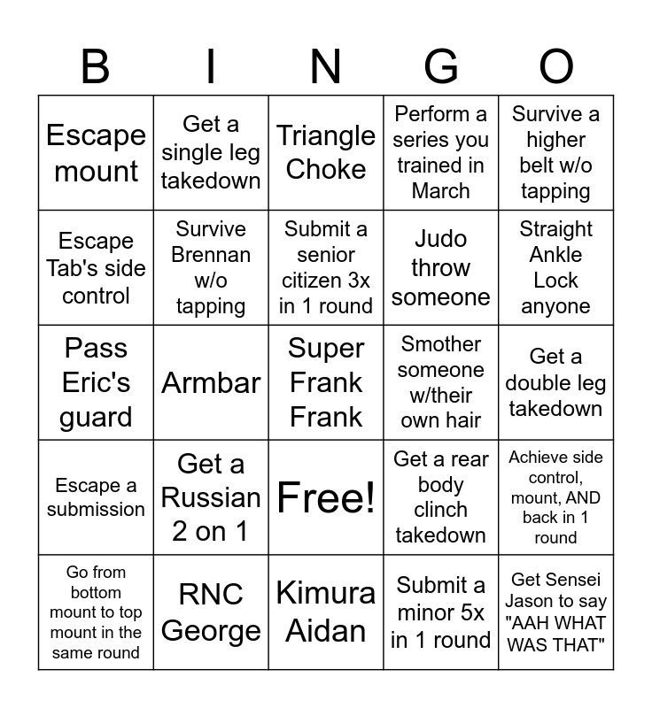 This bingo card has 26 words: Free!, Submit a minor 5x in 1 round, Submit a senior citizen 3x in 1 round, RNC George, Survive a higher belt w/o tapping, Escape mount, Escape Tab's side control, Get a single leg takedown, Get a double leg takedown, Get a rear body clinch takedown, Judo throw someone, Pass Eric's guard, Achieve side control, mount, AND back in 1 round, Go from bottom mount to top mount in the same round, Armbar, Say "I'M NOT DONE YET" then escape back, Perform a series you trained in March, Escape a submission, Triangle Choke, Super Frank Frank, Straight Ankle Lock anyone, Kimura Aidan, Smother someone w/their own hair, Get a Russian 2 on 1, Survive Brennan w/o tapping and Get Sensei Jason to say "AAH WHAT WAS THAT".