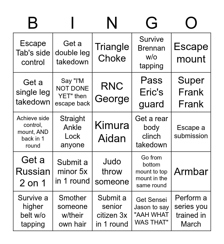 This bingo card has 25 words: Submit a minor 5x in 1 round, Submit a senior citizen 3x in 1 round, RNC George, Survive a higher belt w/o tapping, Escape mount, Escape Tab's side control, Get a single leg takedown, Get a double leg takedown, Get a rear body clinch takedown, Judo throw someone, Pass Eric's guard, Achieve side control, mount, AND back in 1 round, Go from bottom mount to top mount in the same round, Armbar, Say "I'M NOT DONE YET" then escape back, Perform a series you trained in March, Escape a submission, Triangle Choke, Super Frank Frank, Straight Ankle Lock anyone, Kimura Aidan, Smother someone w/their own hair, Get a Russian 2 on 1, Survive Brennan w/o tapping and Get Sensei Jason to say "AAH WHAT WAS THAT".
