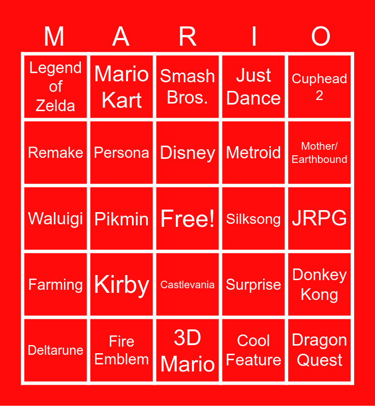 This bingo card has a free space and 24 words: Kirby, Fire Emblem, Disney, Deltarune, Cuphead 2, Legend of Zelda, Remake, Mario Kart, Silksong, Castlevania, Metroid, Waluigi, Surprise, Donkey Kong, Persona, Cool Feature, JRPG, Smash Bros., Mother/ Earthbound, Pikmin, Dragon Quest, Farming, Just Dance and 3D Mario.