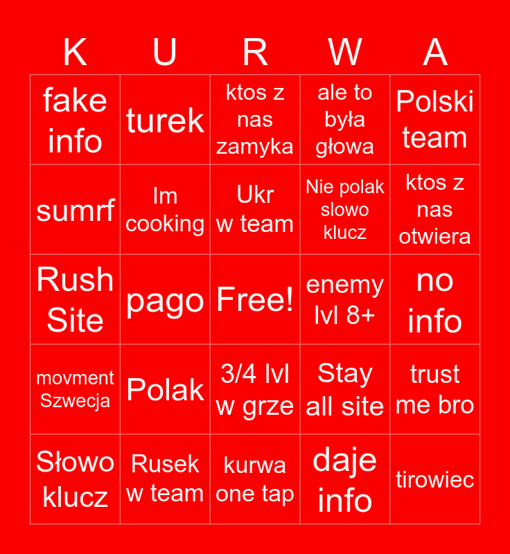 This bingo card has a free space and 24 words: Polak, Rusek w team, Ukr w team, Słowo klucz, Polski team, fake info, sumrf, turek, enemy lvl 8+, 3/4 lvl w grze, Nie polak slowo klucz, Rush Site, Stay all site, trust me bro, Im cooking, daje info, no info, ktos z nas zamyka, ktos z nas otwiera, pago, tirowiec, movment Szwecja, ale to była głowa and kurwa one tap.