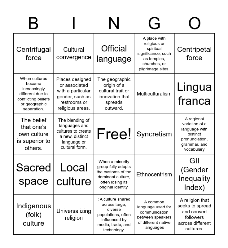 This bingo card has a free space and 25 words: Local culture, : A culture shared across large, diverse populations, often influenced by media, trade, and technology., The geographic origin of a cultural trait or innovation that spreads outward., Indigenous (folk) culture, Centripetal force, Centrifugal force, When cultures become increasingly different due to conflicting beliefs or geographic separation., Cultural convergence, Syncretism, When a minority group fully adopts the customs of the dominant culture, often losing its original identity., Multiculturalism, The belief that one’s own culture is superior to others., Ethnocentrism, GII (Gender Inequality Index), Places designed or associated with a particular gender, such as restrooms or religious areas., Language tree, A regional variation of a language with distinct pronunciation, grammar, and vocabulary, Official language, Lingua franca, The blending of languages and cultures to create a new, distinct language or cultural form., A religion that seeks to spread and convert followers across different cultures., Universalizing religion, Sacred space, A place with religious or spiritual significance, such as temples, churches, or pilgrimage sites. and A common language used for communication between speakers of different native languages.