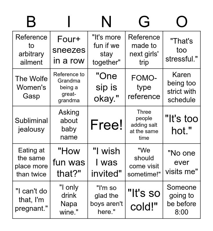 This bingo card has a free space and 24 words: "How fun was that?", "I only drink Napa wine.", "One sip is okay.", "I can't do that, I'm pregnant.", "That's too stressful.", Reference to arbitrary ailment, The Wolfe Women's Gasp, Four+ sneezes in a row, Three people adding salt at the same time, "I wish I was invited", FOMO-type reference, Subliminal jealousy, "We should come visit sometime!", "No one ever visits me", Reference to Grandma being a great-grandma, "It's so cold!", "It's too hot.", "It's more fun if we stay together", Karen being too strict with schedule, Asking about baby name, Someone going to be before 8:00, Eating at the same place more than twice, Reference made to next girls' trip and "I'm so glad the boys aren't here.".
