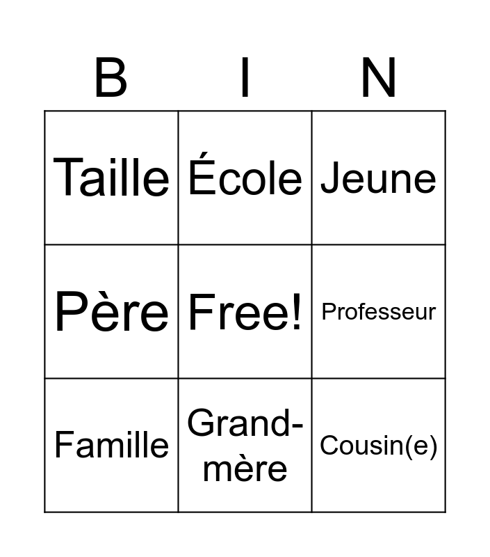 This bingo card has a free space and 50 words: Bonjour, Salut, Nom, Prénom, Âge, Anniversaire, École, Classe, Professeur, Ami(e), Famille, Père, Mère, Frère, Sœur, Grand-père, Grand-mère, Oncle, Tante, Cousin(e), Cheveux, Yeux, Taille, Grand(e), Petit(e), Mince, Gros(se), Beau/Belle, Jeune, Vieux/Vieille, Maison, École, Parc, Cinéma, Magasin, Restaurant, Plage, Montagne, Ville, Campagne, Chien, Chat, Livre, Musique, Sport, Vélo, Voiture, Jardin, Ordinateur and Télévision.