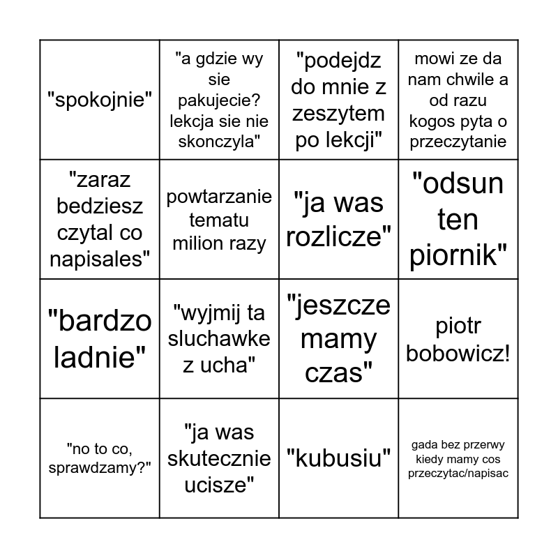 This bingo card has 16 words: "ja was skutecznie ucisze", piotr bobowicz!, "podejdz do mnie z zeszytem po lekcji", "spokojnie", "bardzo ladnie", "a gdzie wy sie pakujecie? lekcja sie nie skonczyla", "jeszcze mamy czas", "kubusiu", "zaraz bedziesz czytal co napisales", powtarzanie tematu milion razy, "no to co, sprawdzamy?", mowi ze da nam chwile a od razu kogos pyta o przeczytanie, "wyjmij ta sluchawke z ucha", "odsun ten piornik", "ja was rozlicze" and gada bez przerwy kiedy mamy cos przeczytac/napisac.