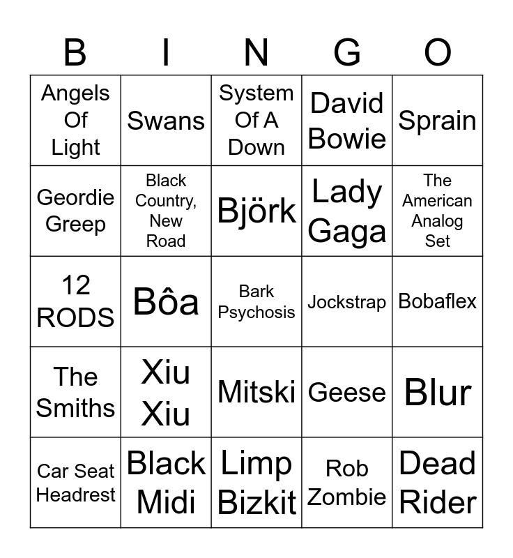This bingo card has a free space and 24 words: Xiu Xiu, Black Midi, Björk, Car Seat Headrest, Sprain, Angels Of Light, Geordie Greep, Swans, Jockstrap, Mitski, Lady Gaga, 12 RODS, Geese, Blur, Black Country, New Road, Rob Zombie, Bobaflex, System Of A Down, The American Analog Set, Bôa, Dead Rider, The Smiths, David Bowie and Limp Bizkit.