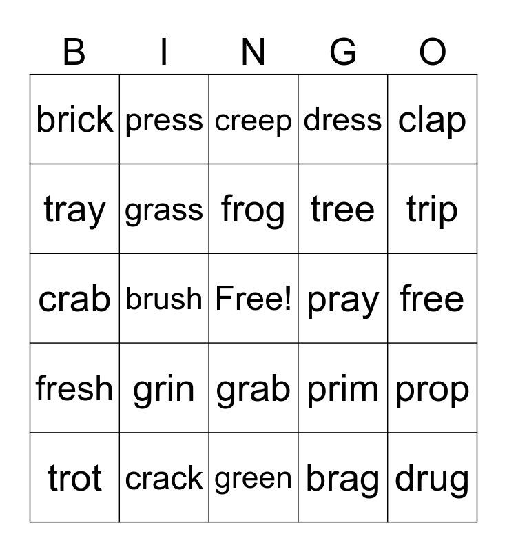 This bingo card has a free space and 28 words: prop, brass, tree, brag, tray, creep, press, fresh, pray, trot, crab, dress, crack, green, trip, drop, grin, grass, frog, grab, brick, drip, drug, brush, free, prim, clap and crop.