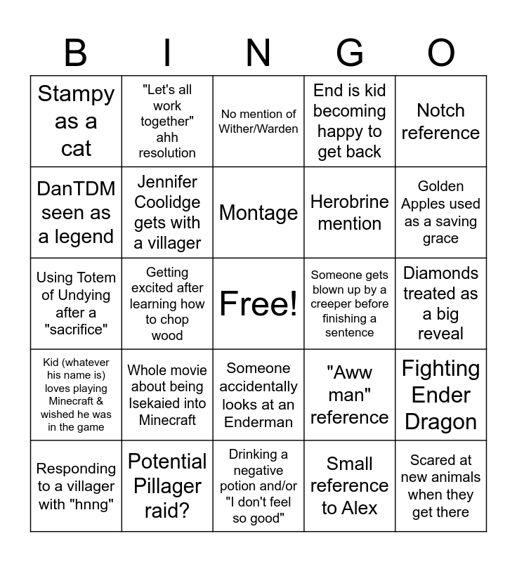 This bingo card has a free space and 24 words: Whole movie about being Isekaied into Minecraft, Potential Pillager raid?, Montage, Responding to a villager with "hnng", Notch reference, Stampy as a cat, DanTDM seen as a legend, "Let's all work together" ahh resolution, Someone gets blown up by a creeper before finishing a sentence, Someone accidentally looks at an Enderman, Herobrine mention, Using Totem of Undying after a "sacrifice", "Aww man" reference, Fighting Ender Dragon, Jennifer Coolidge gets with a villager, Small reference to Alex, Diamonds treated as a big reveal, No mention of Wither/Warden, Golden Apples used as a saving grace, Getting excited after learning how to chop wood, Scared at new animals when they get there, Kid (whatever his name is) loves playing Minecraft & wished he was in the game, End is kid becoming happy to get back and Drinking a negative potion and/or "I don't feel so good".
