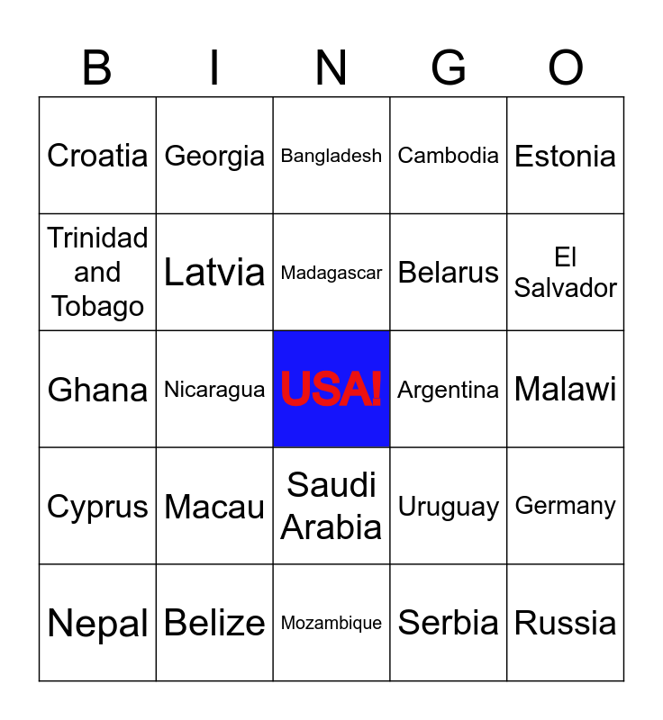 This bingo card has a free space and 177 words: Afghanistan, Albania, Algeria, Angola, Argentina, Armenia, Aruba, Australia, Austria, Azerbaijan, Bahamas, Bahrain, Bangladesh, Barbados, Belarus, Belgium, Belize, Benin, Bermuda, Bhutan, Bolivia, Bosnia and Herzegovina, Botswana, Brazil, Brunei, Bulgaria, Burkina Faso, Burundi, Cambodia, Cameroon, Canada, Cape Verde, Cayman Islands, Chad, Chile, China, Colombia, Comoros, Congo, Costa Rica, Croatia, Cuba, Cyprus, Czech Republic, Denmark, Djibouti, Dominican Republic, East Timor, Ecuador, Egypt, El Salvador, Eritrea, Estonia, Ethiopia, Euro Area, European Union, Faroe Islands, Fiji, Finland, France, Gambia, Georgia, Germany, Ghana, Greece, Guatemala, Guinea, Guinea Bissau, Guyana, Haiti, Honduras, Hong Kong, Hungary, Iceland, India, Indonesia, Iran, Iraq, Ireland, Israel, Italy, Ivory Coast, Jamaica, Japan, Jordan, Kazakhstan, Kenya, Kosovo, Kuwait, Kyrgyzstan, Laos, Latvia, Lebanon, Lesotho, Liberia, Libya, Liechtenstein, Lithuania, Luxembourg, Macau, Macedonia, Madagascar, Malawi, Malaysia, Maldives, Mali, Malta, Mauritania, Mauritius, Mexico, Moldova, Monaco, Mongolia, Montenegro, Morocco, Mozambique, Namibia, Nepal, Netherlands, New Caledonia, New Zealand, Nicaragua, Niger, Nigeria, North Korea, Norway, Oman, Pakistan, Palestine, Panama, Papua New Guinea, Paraguay, Peru, Philippines, Poland, Portugal, Puerto Rico, Qatar, Romania, Russia, Rwanda, Sao Tome and Principe, Saudi Arabia, Senegal, Serbia, Seychelles, Sierra Leone, Singapore, Slovakia, Slovenia, Somalia, South Africa, South Korea, Spain, Sri Lanka, Suriname, Swaziland, Sweden, Switzerland, Syria, Taiwan, Tajikistan, Tanzania, Thailand, Trinidad and Tobago, Tunisia, Turkey, Turkmenistan, Uganda, Ukraine, United Kingdom, Uruguay, Uzbekistan, Vietnam, Yemen, Zambia and Zimbabwe.