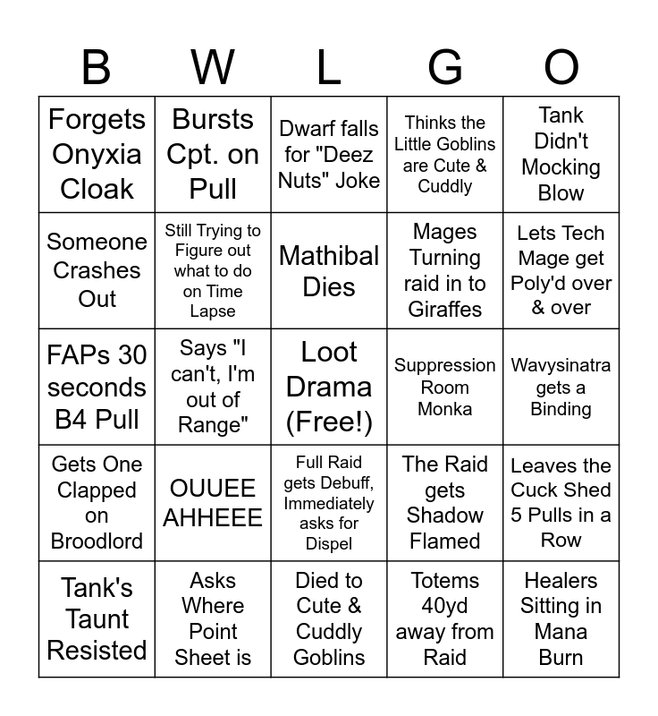This bingo card has a free space and 24 words: OUUEE AHHEEE, Asks Where Point Sheet is, Mathibal Dies, Tank's Taunt Resisted, Tank Didn't Mocking Blow, Forgets Onyxia Cloak, Someone Crashes Out, Bursts Cpt. on Pull, Suppression Room Monka, Full Raid gets Debuff, Immediately asks for Dispel, Mages Turning raid in to Giraffes, FAPs 30 seconds B4 Pull, The Raid gets Shadow Flamed, Leaves the Cuck Shed 5 Pulls in a Row, Still Trying to Figure out what to do on Time Lapse, Totems 40yd away from Raid, Wavysinatra gets a Binding, Dwarf falls for "Deez Nuts" Joke, Lets Tech Mage get Poly'd over & over, Says "I can't, I'm out of Range", Healers Sitting in Mana Burn, Gets One Clapped on Broodlord, Thinks the Little Goblins are Cute & Cuddly and Died to Cute & Cuddly Goblins.
