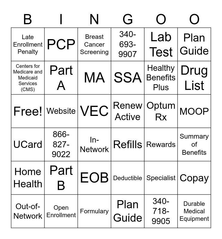 This bingo card has 36 words: Deductible, EOB, Plan Guide, Centers for Medicare and Medicaid Services (CMS), UCard, Renew Active, Part A, Formulary, Lab Test, Specialist, Drug List, 340-693-9907, Copay, Website, SSA, Late Enrollment Penalty, Home Health, Optum Rx, Free!, Breast Cancer Screening, VEC, 866-827-9022, Refills, In-Network, Rewards, PCP, Healthy Benefits Plus, Open Enrollment, MA, Plan Guide, Durable Medical Equipment, Out-of-Network, Summary of Benefits, MOOP, Part B and 340-718-9905.
