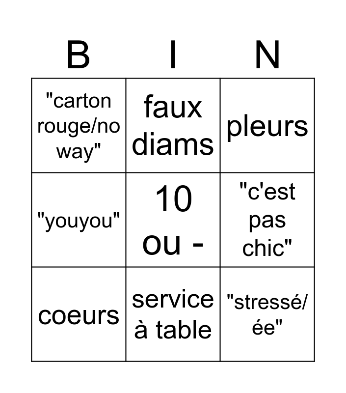 This bingo card has a free space and 8 words: "c'est pas chic", pleurs, faux diams, coeurs, "carton rouge/no way", "stressé/ée", "youyou" and service à table.