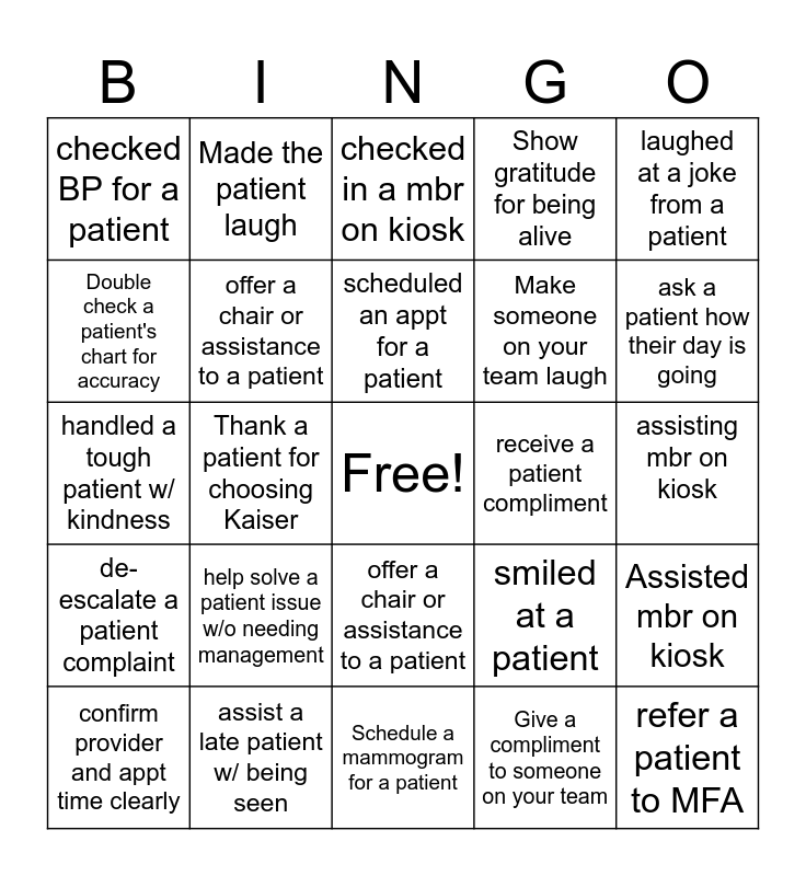 This bingo card has a free space and 28 words: Assisted mbr on kiosk, create a moment of joy for a patient, Make someone on your team laugh, Give a compliment to someone on your team, Double check a patient's chart for accuracy, checked in a mbr on kiosk, Made the patient laugh, de-escalate a patient complaint, receive a patient compliment, confirm provider and appt time clearly, handled a tough patient w/ kindness, Show gratitude for being alive, assist a late patient w/ being seen, Schedule a mammogram for a patient, ask a patient how their day is going, cleaned a patient room, help solve a patient issue w/o needing management, offer a chair or assistance to a patient, scheduled an appt for a patient, offer a chair or assistance to a patient, checked BP for a patient, help a walk in patient w/ no appointment, refer a patient to MFA, Thank a patient for choosing Kaiser, assisting mbr on kiosk, smiled at a patient, laughed at a joke from a patient and showed love and compassion to a patient.