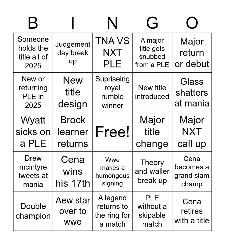 This bingo card has a free space and 24 words: Cena wins his 17th, Aew star over to wwe, Supriseing royal rumble winner, Double champion, Major return or debut, Someone holds the title all of 2025, New or returning PLE in 2025, Judgement day break up, Major title change, Wwe makes a humongous signing, New title introduced, Wyatt sicks on a PLE, Theory and waller break up, Cena becomes a grand slam champ, New title design, PLE without a skipable match, Major NXT call up, TNA VS NXT PLE, Glass shatters at mania, Brock learner returns, Cena retires with a title, Drew mcintyre tweets at mania, A major title gets snubbed from a PLE and A legend returns to the ring for a match.