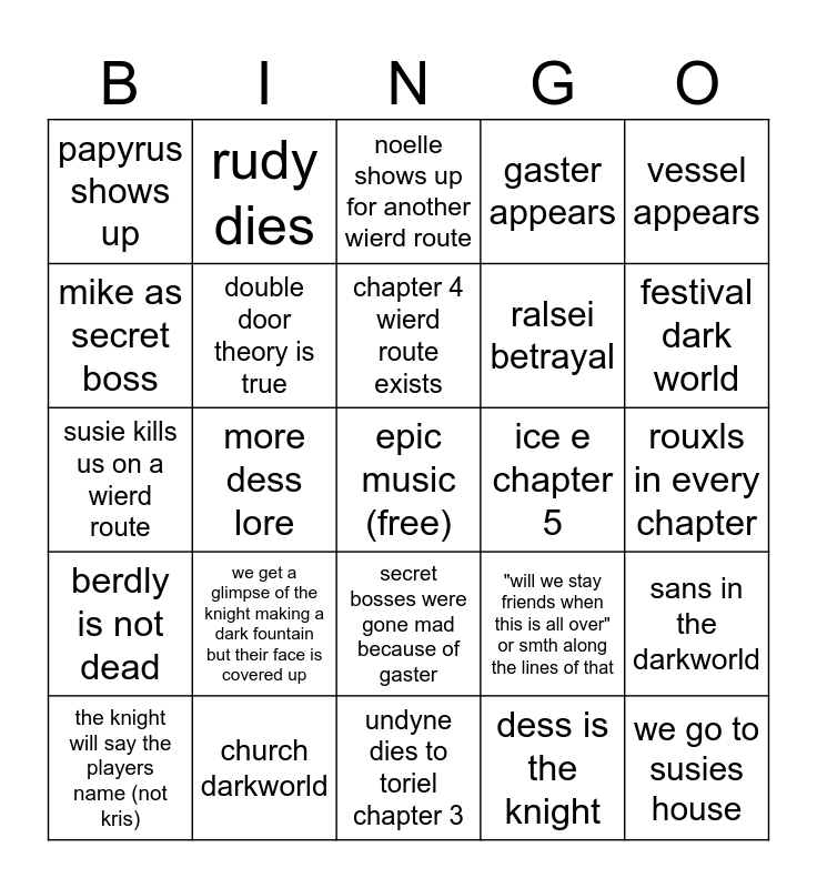 This bingo card has a free space and 24 words: we get a glimpse of the knight making a dark fountain but their face is covered up, church darkworld, chapter 4 wierd route exists, the knight will say the players name (not kris), vessel appears, papyrus shows up, mike as secret boss, rudy dies, ice e chapter 5, secret bosses were gone mad because of gaster, ralsei betrayal, susie kills us on a wierd route, "will we stay friends when this is all over" or smth along the lines of that, sans in the darkworld, double door theory is true, dess is the knight, rouxls in every chapter, noelle shows up for another wierd route, festival dark world, more dess lore, we go to susies house, berdly is not dead, gaster appears and undyne dies to toriel chapter 3.