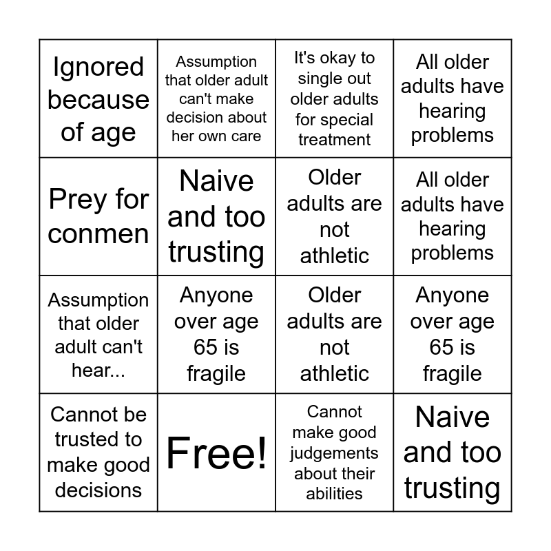 This bingo card has 16 words: Free!, Anyone over age 65 is fragile, It's okay to single out older adults for special treatment, Ignored because of age, Assumption that older adult can't hear..., Assumption that older adult can't make decision about her own care, Older adults are not athletic, Cannot make good judgements about their abilities, Prey for conmen, Naive and too trusting, Cannot be trusted to make good decisions, All older adults have hearing problems, Anyone over age 65 is fragile, All older adults have hearing problems, Older adults are not athletic and Naive and too trusting.