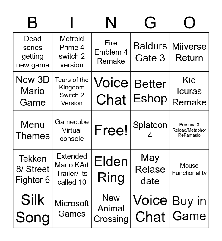 This bingo card has a free space and 24 words: Extended Mario KArt Trailer/ its called 10, Microsoft Games, Voice Chat, Silk Song, Miiverse Return, Dead series getting new game, New 3D Mario Game, Metroid Prime 4 switch 2 version, Splatoon 4, Elden Ring, Better Eshop, Menu Themes, May Relase date, Mouse Functionality, Tears of the Kingdom Switch 2 Version, Voice Chat, Persona 3 Reload/Metaphor ReFantasio, Fire Emblem 4 Remake, Kid Icuras Remake, Gamecube Virtual console, Buy in Game, Tekken 8/ Street Fighter 6, Baldurs Gate 3 and New Animal Crossing.