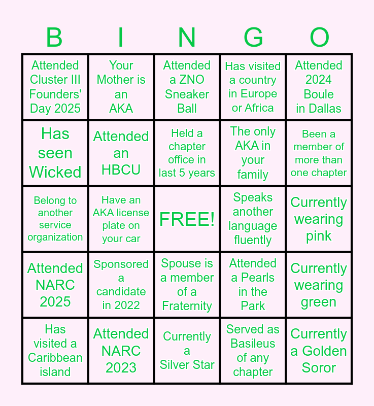 This bingo card has a free space and 24 words: Sponsored a candidate in 2022, Attended NARC 2023, Held a chapter office in last 5 years, Has visited a Caribbean island, Attended 2024 Boule in Dallas, Attended Cluster III Founders' Day 2025, Has seen Wicked, Your Mother is an AKA, Speaks another language fluently, Spouse is a member of a Fraternity, The only AKA in your family, Belong to another service organization, Attended a Pearls in the Park, Currently wearing green, Attended an HBCU, Served as Basileus of any chapter, Currently wearing pink, Attended a ZNO Sneaker Ball, Been a member of more than one chapter, Have an AKA license plate on your car, Currently a Golden Soror, Attended NARC 2025, Has visited a country in Europe or Africa and Currently a Silver Star.