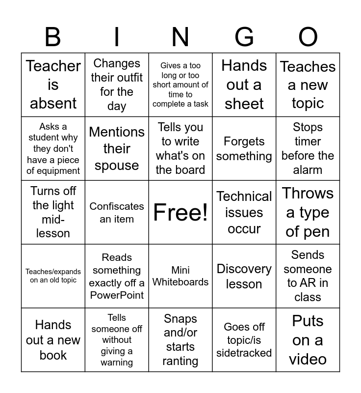 This bingo card has a free space and 34 words: Explains something too fast or for too long, Goes off topic/is sidetracked, Stands at the back of the class, Makes an out-of-pocket comment, Teaches/expands on an old topic, Mentions their spouse, Teaches a new topic, Hands out a new book, Changes their outfit for the day, 'You need to' or 'Your task is', Tells you to write what's on the board, Gives a too long or too short amount of time to complete a task, Out of school substitute, Uses the visualiser, Technical issues occur, Stops timer before the alarm, Tells someone off without giving a warning, Turns off the light mid-lesson, Reads something exactly off a PowerPoint, Discovery lesson, Mini Whiteboards, Gives a warning, Teacher is absent, Throws a type of pen, Snaps and/or starts ranting, Puts on a video, Hands out a sheet, Walks around the class looking at work, Forgets something, Asks a student why they don't have a piece of equipment, Holds class back after the bell, Confiscates an item, Sends someone to AR in class and Gives encouragement.