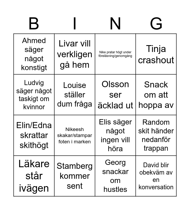 This bingo card has 16 words: Stamberg kommer sent, Random skit händer nedanför trappan, Nike pratar högt under föreläsning/genomgång, Ahmed säger något konstigt, Elin/Edna skrattar skithögt, Livar vill verkligen gå hem, Elis säger något ingen vill höra, Georg snackar om hustles, Ludvig säger något taskigt om kvinnor, Louise ställer dum fråga, Läkare står ivägen, Tinja crashout, Nikeesh skakar/stampar foten i marken, Snack om att hoppa av, Olsson ser äcklad ut and David blir obekväm av en konversation.