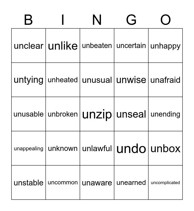 This bingo card has a free space and 24 words: unknown, uncommon, unusual, unstable, unhappy, unclear, untying, unlike, unseal, unlawful, unwise, unusable, undo, unbox, unheated, unearned, unending, unbeaten, unafraid, unbroken, uncomplicated, unappealing, uncertain and unaware.