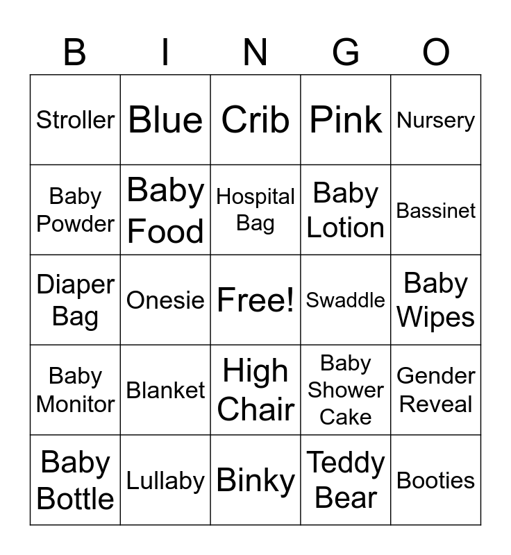 This bingo card has a free space and 29 words: Baby Bottle, Pacifier, Onesie, Diaper, Stroller, Crib, Baby Food, Blanket, Swaddle, Lullaby, Baby Wipes, Booties, Binky, Teddy Bear, Bassinet, Playpen, High Chair, Baby Monitor, Nursery, Diaper Bag, Baby Shower Cake, Crawl, Baby Lotion, Baby Powder, Pink, Blue, Gender Reveal, Hospital Bag and Mother.