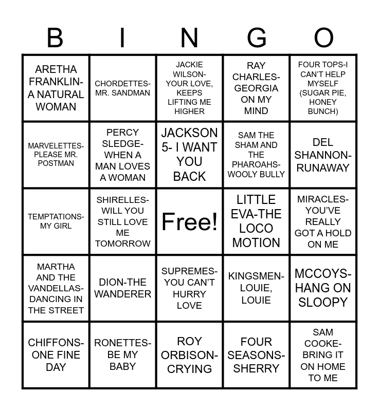 This bingo card has a free space and 40 words: MARVIN GAYE- I HEARD IT THROUGH THE GRAPEVINE, TEMPTATIONS-MY GIRL, JAMES BROWN- PAPAS GOT A BRAND NEW BAG, PERCY SLEDGE- WHEN A MAN LOVES A WOMAN, RONETTES-BE MY BABY, SUPREMES-YOU CAN’T HURRY LOVE, JACKSON 5- I WANT YOU BACK, SAM AND DAVE-SOUL MAN, FOUR TOPS-I CAN’T HELP MYSELF (SUGAR PIE, HONEY BUNCH), MARTHA AND THE VANDELLAS-DANCING IN THE STREET, SHIRELLES-WILL YOU STILL LOVE ME TOMORROW, RAY CHARLES-GEORGIA ON MY MIND, SAM COOKE-BRING IT ON HOME TO ME, MIRACLES-YOU’VE REALLY GOT A HOLD ON ME, LITTLE EVA-THE LOCO MOTION, DION-THE WANDERER, DRIFTERS-UNDER THE BOARDWALK, ARETHA FRANKLIN- A NATURAL WOMAN, IKE AND TINA-AIN’T NO MOUNTAIN HIGH ENOUGH, JACKIE WILSON- YOUR LOVE, KEEPS LIFTING ME HIGHER, MCCOYS-HANG ON SLOOPY, FOUR SEASONS-SHERRY, SAM THE SHAM AND THE PHAROAHS-WOOLY BULLY, MARVELETTES-PLEASE MR. POSTMAN, CHUBBY CHECKER- THE TWIST, ANGELS-MY BOYFRIEND’S BACK, DIXIE CUPS-CHAPEL OF LOVE, GENE CHANDLER-DUKE OF EARL, ETTA JAMES-AT LAST, SHANGRI-LAS-LEADER OF THE PACK, MARCELS-BLUE MOON, CHIFFONS-ONE FINE DAY, MANFORD MANN-DO WAH DIDDY DIDDY, KINGSMEN- LOUIE, LOUIE, DEL SHANNON-RUNAWAY, ROY ORBISON-CRYING, RIGHTEOUS BROTHERS-UNCHAINED MEDLEY, MAURICE AND THE ZODIACS-STAY, CHORDETTES-MR. SANDMAN and PENGUINS-EARTH ANGEL.