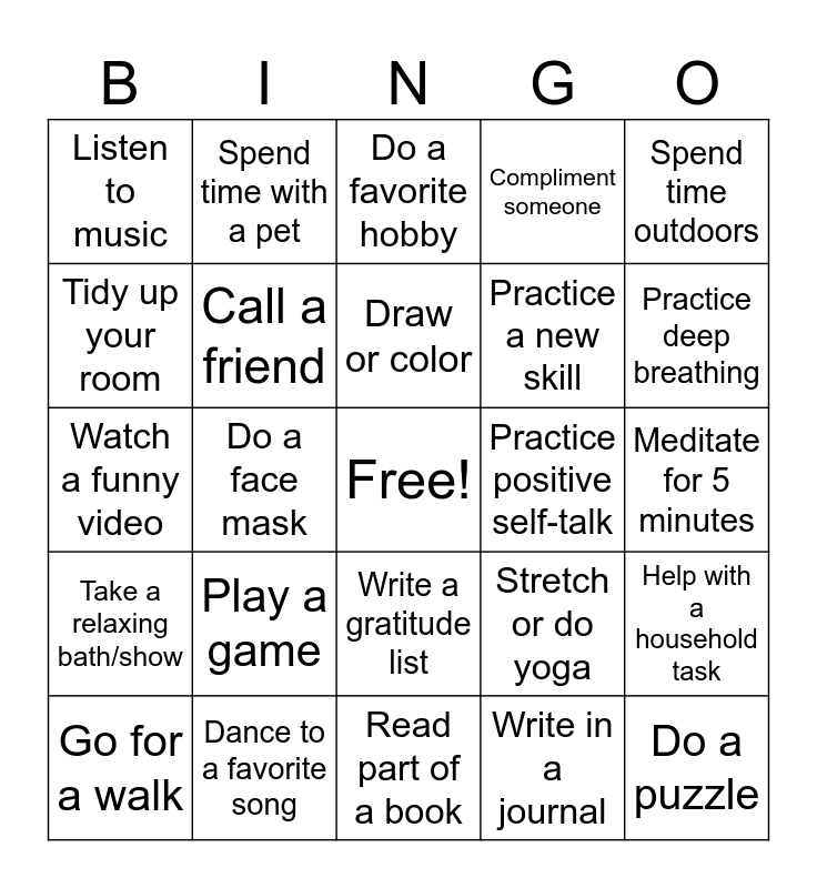 This bingo card has a free space and 25 words: Go for a walk, Play a game, Draw or color, Write in a journal, Practice deep breathing, Listen to music, Spend time with a pet, Do a favorite hobby, Practice a new skill, Help with a household task, Watch a funny video, Call a friend, Stretch or do yoga, Do a puzzle, Tidy up your room, Dance to a favorite song, Read part of a book, Compliment someone, Meditate for 5 minutes, Take a relaxing bath/show, Do a face mask, Write a gratitude list, Practice positive self-talk, Spend time outdoors and Do a random act of kindness.