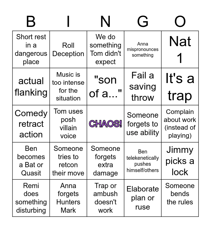 This bingo card has a free space and 44 words: Remi asks hypothetical question, Someone bends the rules, Spend 30 mins in one room, Remi does something disturbing, We ask for NPC's name, Elaborate plan or ruse, We do something Tom didn't expect, Nat 20, Nat 1, Anna forgets Hunters Mark, Anna mispronounces something, Someone forgets to use ability, Someone forgets extra damage, Someone tries to retcon their move, Tag-team slow an enemy, Trap or ambush doesn't work, Forget NPC ally was with us, Comedy retract action, Fi forgets to Guidance, It's a trap, Roll Deception, Jimmy / Remi push enemy backwards, Someone goes down, Short rest in a dangerous place, Get sidetracked, Complain about work (instead of playing), Spend too long looting, Search for valuables, Ben telekenetically pushes himself/others, Ben becomes a Bat or Quasit, Starry form activated, Jimmy picks a lock, Jimmy uses Silent Image, Tom uses his goblin voice, Tom uses posh villain voice, Anna gets a new animal friend, Tom mispronouces Bagel, Tom forgets voice of character, "son of a...", actual flanking, Fail a saving throw, Roll over 25 on a check, Music is too intense for the situation and Someone drops dice on floor.
