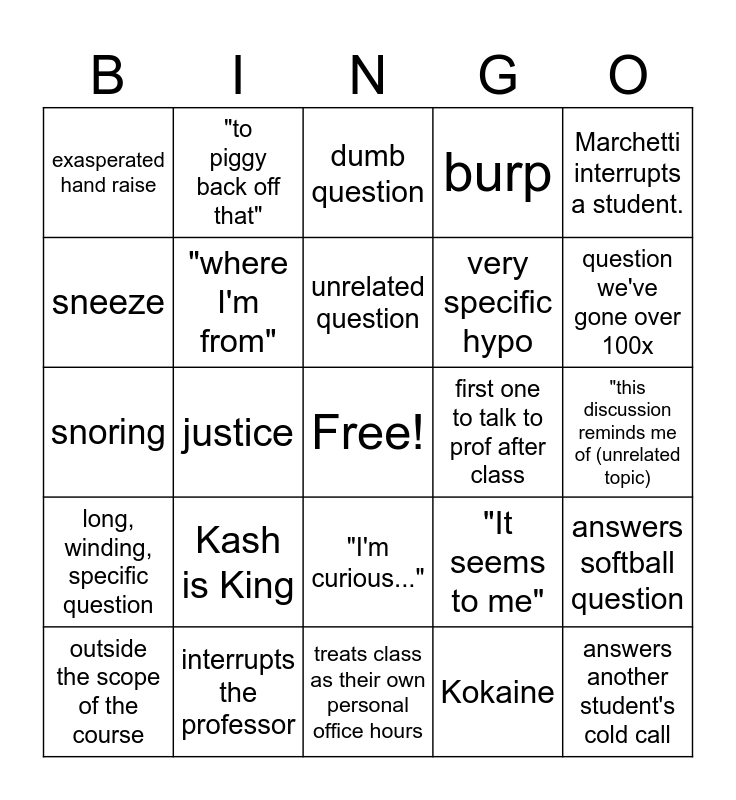 This bingo card has a free space and 24 words: Kash is King, interrupts the professor, unrelated question, outside the scope of the course, Marchetti interrupts a student., exasperated hand raise, sneeze, "to piggy back off that", first one to talk to prof after class, "I'm curious...", very specific hypo, snoring, "It seems to me", answers softball question, "where I'm from", Kokaine, "this discussion reminds me of (unrelated topic), dumb question, question we've gone over 100x, justice, answers another student's cold call, long, winding, specific question, burp and treats class as their own personal office hours.