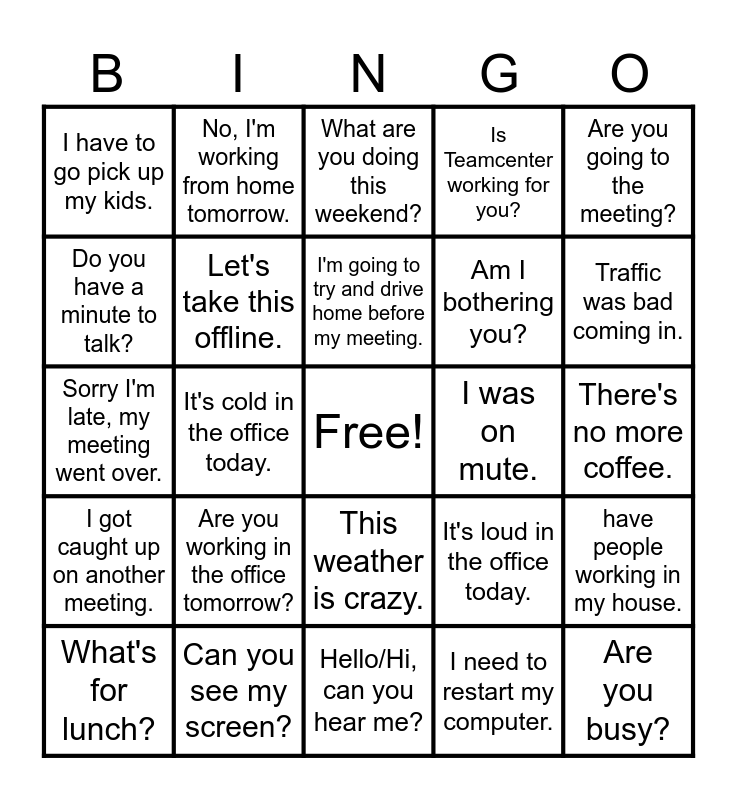 This bingo card has a free space and 24 words: Are you working in the office tomorrow?, Can you see my screen?, I'm going to try and drive home before my meeting., What's for lunch?, Are you going to the meeting?, I have to go pick up my kids., Do you have a minute to talk?, No, I'm working from home tomorrow., I was on mute., This weather is crazy., Am I bothering you?, Sorry I'm late, my meeting went over., It's loud in the office today., have people working in my house., Let's take this offline., I need to restart my computer., There's no more coffee., What are you doing this weekend?, Traffic was bad coming in., It's cold in the office today., Are you busy?, I got caught up on another meeting., Is Teamcenter working for you? and Hello/Hi, can you hear me?.