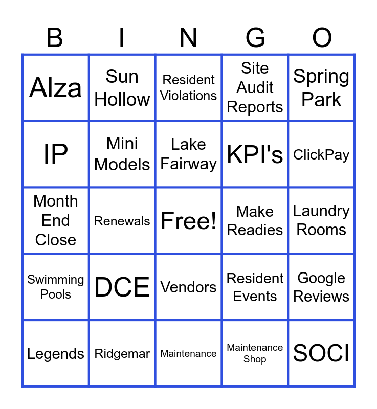 This bingo card has a free space and 24 words: DCE, Ridgemar, Lake Fairway, Legends, Spring Park, Alza, IP, Sun Hollow, Make Readies, Vendors, KPI's, Month End Close, Resident Events, Google Reviews, Mini Models, Maintenance Shop, Laundry Rooms, Resident Violations, ClickPay, Renewals, SOCI, Swimming Pools, Site Audit Reports and Maintenance.