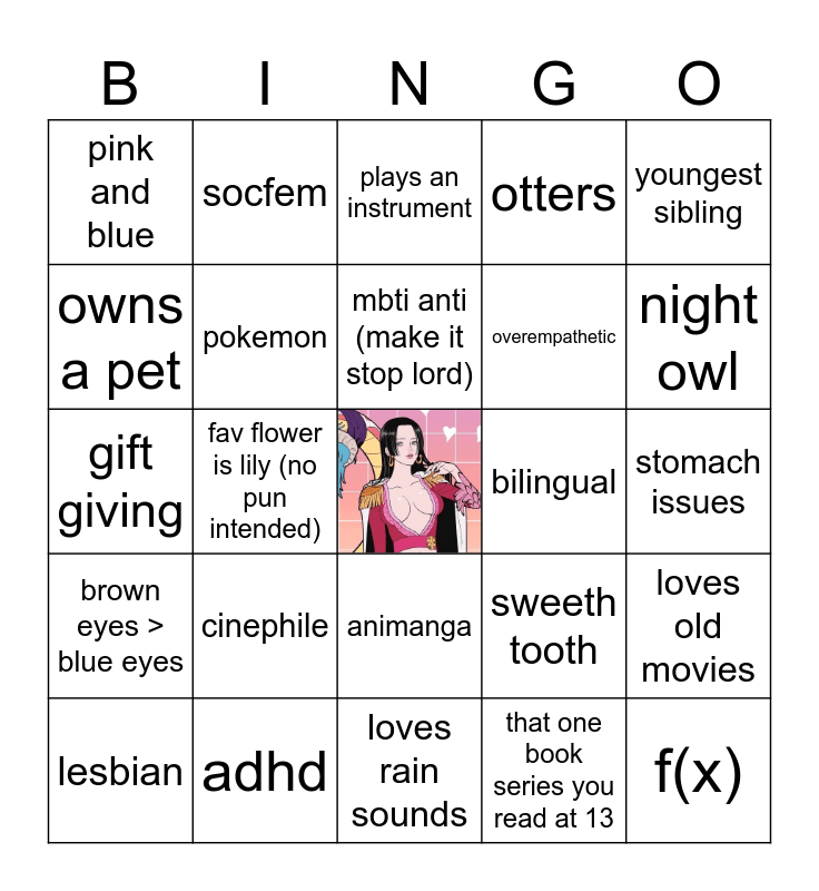 This bingo card has a free space and 24 words: cinephile, adhd, mbti anti (make it stop lord), lesbian, youngest sibling, pink and blue, owns a pet, socfem, bilingual, animanga, overempathetic, gift giving, sweeth tooth, loves old movies, pokemon, that one book series you read at 13, stomach issues, plays an instrument, night owl, fav flower is lily (no pun intended), f(x), brown eyes > blue eyes, otters and loves rain sounds.