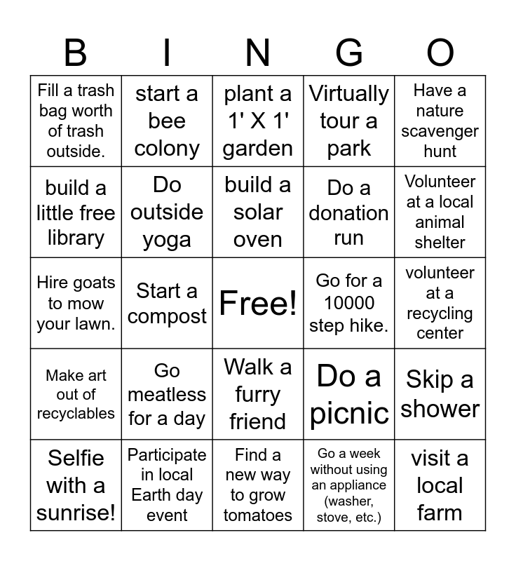 This bingo card has a free space and 29 words: Selfie with a sunrise!, Plant a tree., Start a compost, Visit a new park!, Fill a trash bag worth of trash outside., plant a 1' X 1' garden, Do outside yoga, Go meatless for a day, Go for a 10000 step hike., Participate in local Earth day event, volunteer at a recycling center, visit a local farm, Find a new way to grow tomatoes, Go a week without using an appliance (washer, stove, etc.), Volunteer at a local animal shelter, install a rain barrel, Walk a furry friend, Make art out of recyclables, Have a nature scavenger hunt, Hire goats to mow your lawn., Do a picnic, exchange mystery seeds with friends, Do a donation run, build a little free library, Virtually tour a park, start a bee colony, Skip a shower, build a solar oven and collect cans from neighborhood.