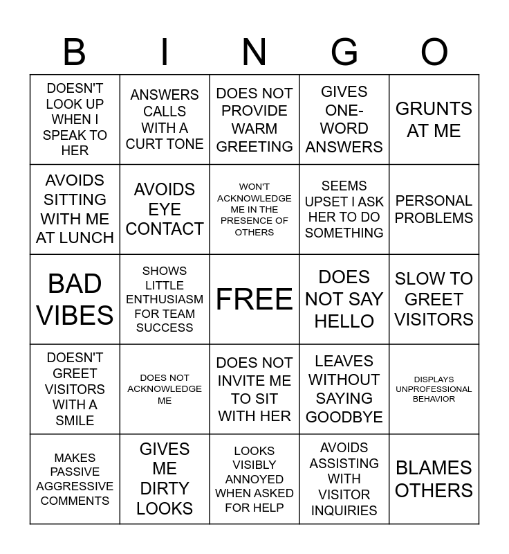 This bingo card has a free space and 24 words: DOES NOT ACKNOWLEDGE ME, GIVES ME DIRTY LOOKS, WON'T ACKNOWLEDGE ME IN THE PRESENCE OF OTHERS, MAKES PASSIVE AGGRESSIVE COMMENTS, GRUNTS AT ME, DOESN'T LOOK UP WHEN I SPEAK TO HER, AVOIDS SITTING WITH ME AT LUNCH, ANSWERS CALLS WITH A CURT TONE, DOES NOT SAY HELLO, DOES NOT INVITE ME TO SIT WITH HER, SEEMS UPSET I ASK HER TO DO SOMETHING, BAD VIBES, LEAVES WITHOUT SAYING GOODBYE, DISPLAYS UNPROFESSIONAL BEHAVIOR, AVOIDS EYE CONTACT, AVOIDS ASSISTING WITH VISITOR INQUIRIES, SLOW TO GREET VISITORS, DOES NOT PROVIDE WARM GREETING, PERSONAL PROBLEMS, SHOWS LITTLE ENTHUSIASM FOR TEAM SUCCESS, BLAMES OTHERS, DOESN'T GREET VISITORS WITH A SMILE, GIVES ONE-WORD ANSWERS and LOOKS VISIBLY ANNOYED WHEN ASKED FOR HELP.