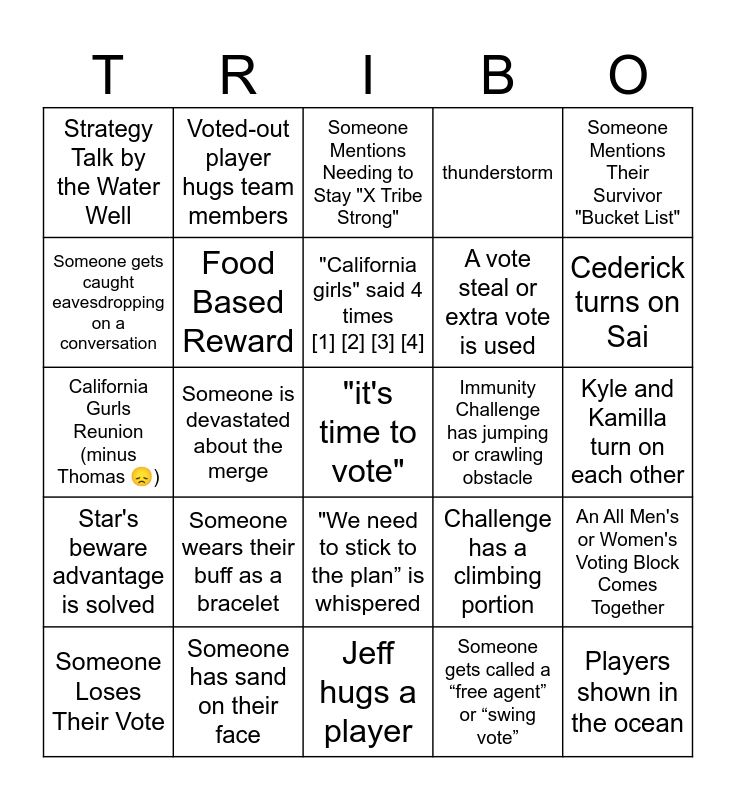 This bingo card has a free space and 36 words: Split vote, New Idol Or Advantage Found, A player goes through another's belongings, Food Based Reward, Challenge has a climbing portion, Star's beware advantage is solved, "California girls" said 4 times [1] [2] [3] [4], A tribe member helps an opposing tribe in a challenge, Someone Mentions Their Survivor "Bucket List", Camera zoom on ball, Someone is devastated about the merge, thunderstorm, Eva trusts another player(s) with her autism "secret", Immunity Challenge has jumping or crawling obstacle, Cederick turns on Sai, Strategy Talk by the Water Well, "I was about to pop off", Someone wears their buff as a bracelet, Players shown in the ocean, Someone Mentions Needing to Stay "X Tribe Strong", Kyle and Kamilla turn on each other, An All Men's or Women's Voting Block Comes Together, Someone has sand on their face, Someone Loses Their Vote, Jeff hugs a player, Voted-out player hugs team members, California Gurls Reunion (minus Thomas 😞), Alliance name is created, A vote steal or extra vote is used, Someone gets caught eavesdropping on a conversation, Medical is called, Jeff gives a nickname to a player, Someone gets called a “free agent” or “swing vote”, "We need to stick to the plan” is whispered, “This is a whole new game now” is said and Someone puts a target on/tries to split up Eva and Joe.
