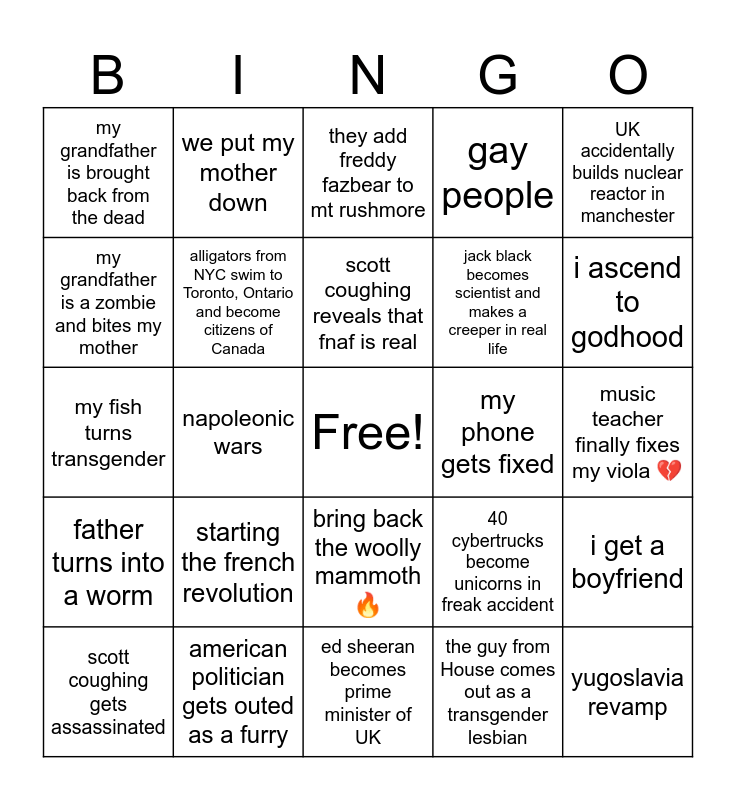 This bingo card has a free space and 24 words: starting the french revolution, american politician gets outed as a furry, scott coughing reveals that fnaf is real, scott coughing gets assassinated, UK accidentally builds nuclear reactor in manchester, my grandfather is brought back from the dead, my grandfather is a zombie and bites my mother, we put my mother down, my phone gets fixed, bring back the woolly mammoth ️🔥, jack black becomes scientist and makes a creeper in real life, my fish turns transgender, 40 cybertrucks become unicorns in freak accident, i get a boyfriend, alligators from NYC swim to Toronto, Ontario and become citizens of Canada, the guy from House comes out as a transgender lesbian, music teacher finally fixes my viola 💔, they add freddy fazbear to mt rushmore, i ascend to godhood, napoleonic wars, yugoslavia revamp, father turns into a worm, gay people and ed sheeran becomes prime minister of UK.