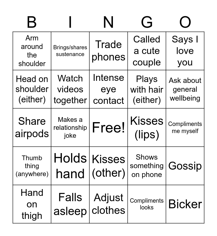This bingo card has a free space and 24 words: Holds hand, Falls asleep, Intense eye contact, Hand on thigh, Says I love you, Arm around the shoulder, Head on shoulder (either), Brings/shares sustenance, Kisses (lips), Kisses (other), Plays with hair (either), Share airpods, Shows something on phone, Gossip, Watch videos together, Compliments looks, Compliments me myself, Trade phones, Ask about general wellbeing, Makes a relationship joke, Bicker, Thumb thing (anywhere), Called a cute couple and Adjust clothes.