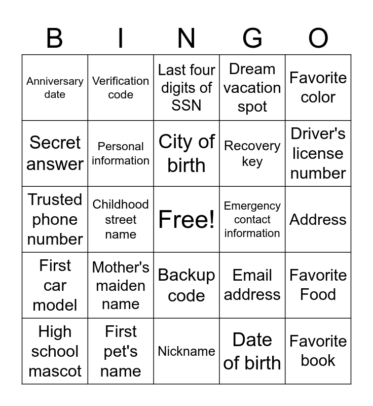 This bingo card has a free space and 24 words: Mother's maiden name, First pet's name, City of birth, High school mascot, Favorite color, Anniversary date, Secret answer, Verification code, Emergency contact information, Backup code, Recovery key, Trusted phone number, Email address, Favorite Food, Personal information, Date of birth, Address, Last four digits of SSN, Driver's license number, Childhood street name, Favorite book, First car model, Dream vacation spot and Nickname.