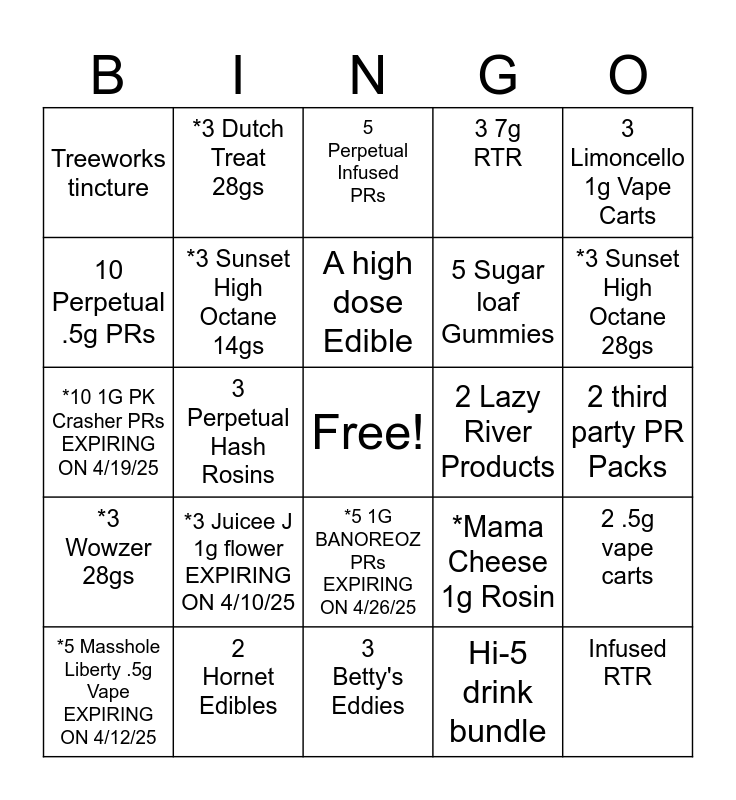 This bingo card has a free space and 24 words: *3 Juicee J 1g flower EXPIRING ON 4/10/25, 2 Hornet Edibles, A high dose Edible, *5 Masshole Liberty .5g Vape EXPIRING ON 4/12/25, 3 Limoncello 1g Vape Carts, Treeworks tincture, 10 Perpetual .5g PRs, *3 Dutch Treat 28gs, 2 Lazy River Products, *5 1G BANOREOZ PRs EXPIRING ON 4/26/25, 5 Sugar loaf Gummies, *10 1G PK Crasher PRs EXPIRING ON 4/19/25, *Mama Cheese 1g Rosin, 2 .5g vape carts, *3 Sunset High Octane 14gs, Hi-5 drink bundle, 2 third party PR Packs, 5 Perpetual Infused PRs, *3 Sunset High Octane 28gs, 3 Perpetual Hash Rosins, Infused RTR, *3 Wowzer 28gs, 3 7g RTR and 3 Betty's Eddies.