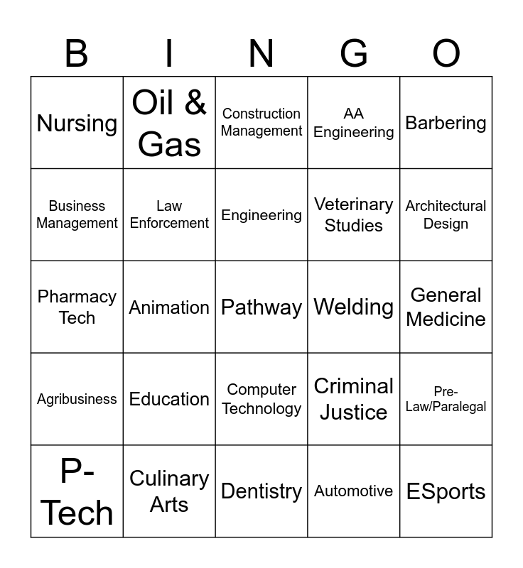 This bingo card has a free space and 24 words: Education, Culinary Arts, Engineering, P-Tech, Barbering, Nursing, Business Management, Oil & Gas, Welding, Computer Technology, Veterinary Studies, Pharmacy Tech, Criminal Justice, Pre-Law/Paralegal, Law Enforcement, Automotive, General Medicine, Construction Management, Architectural Design, Animation, ESports, Agribusiness, AA Engineering and Dentistry.
