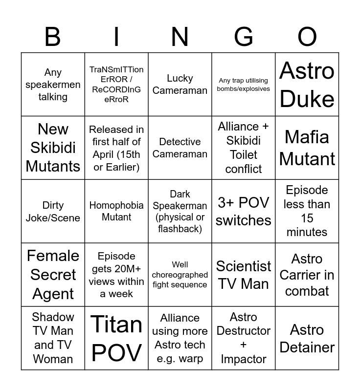 This bingo card has a free space and 24 words: Episode gets 20M+ views within a week, Titan POV, Detective Cameraman, Shadow TV Man and TV Woman, Astro Duke, Any speakermen talking, New Skibidi Mutants, TraNSmITTion ErROR / ReCORDInG eRroR, 3+ POV switches, Well choreographed fight sequence, Alliance + Skibidi Toilet conflict, Dirty Joke/Scene, Scientist TV Man, Astro Carrier in combat, Released in first half of April (15th or Earlier), Astro Destructor + Impactor, Episode less than 15 minutes, Lucky Cameraman, Mafia Mutant, Homophobia Mutant, Astro Detainer, Female Secret Agent, Any trap utilising bombs/explosives and Alliance using more Astro tech e.g. warp.
