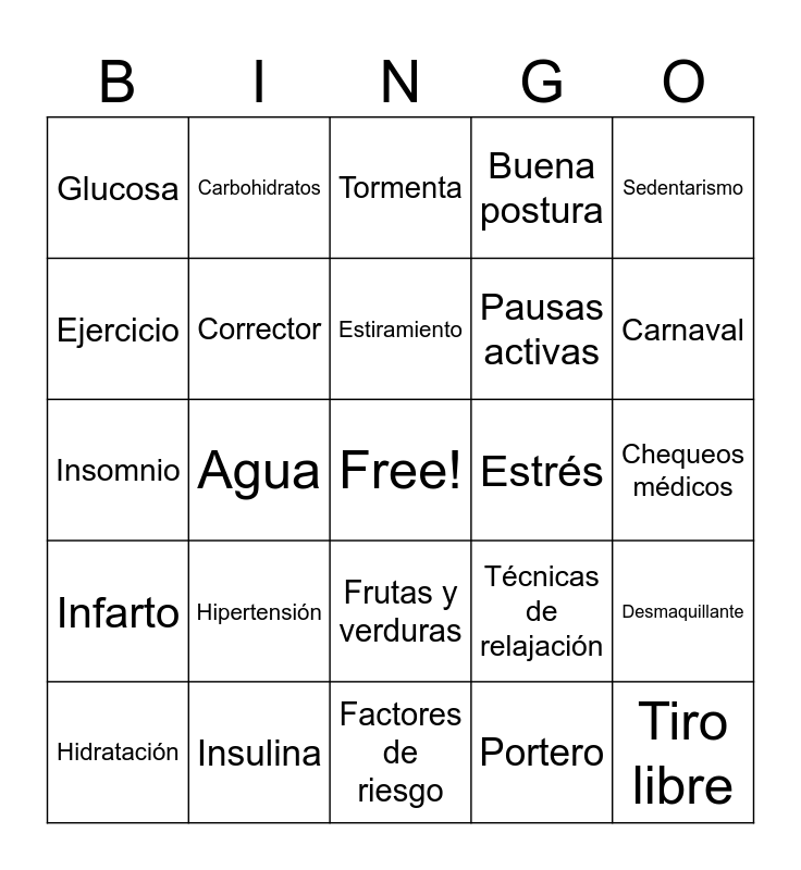 This bingo card has a free space and 24 words: Hipertensión, Insulina, Estiramiento, Hidratación, Sedentarismo, Glucosa, Ejercicio, Carbohidratos, Estrés, Frutas y verduras, Pausas activas, Insomnio, Técnicas de relajación, Desmaquillante, Corrector, Portero, Chequeos médicos, Tormenta, Carnaval, Agua, Tiro libre, Infarto, Buena postura and Factores de riesgo.