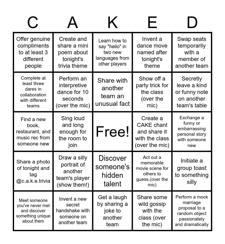 This bingo card has a free space and 24 words: Meet someone you've never met and discover something unique about them, Draw a silly portrait of another team's player (show them!), Share with another team an unusual fact, Share some wild gossip with the class (over the mic), Swap seats temporarily with a member of another team, Offer genuine compliments to at least 3 different people, Create and share a mini poem about tonight's trivia theme, Learn how to say "hello" in two new languages from other players, Create a CAKE chant and share it with the class (over the mic), Exchange a funny or embarrassing personal story with someone new, Find a new book, restaurant, and music rec from someone new, Perform an interpretive dance for 10 seconds (over the mic), Act out a memorable movie scene for others to guess.(over the mic), Initiate a group toast to something silly, Complete at least three dares in collaboration with different teams, Invent a new secret handshake with someone on another team, Get a laugh by sharing a joke to another team, Invent a dance move named after tonight's theme, Secretly leave a kind or funny note on another team's table, Share a photo of tonight and tag @c.a.k.e.trivia, Sing loud and long enough for the room to join, Discover someone's hidden talent, Show off a party trick for the class (over the mic) and Perform a mock marriage proposal to a random object passionately and dramatically.