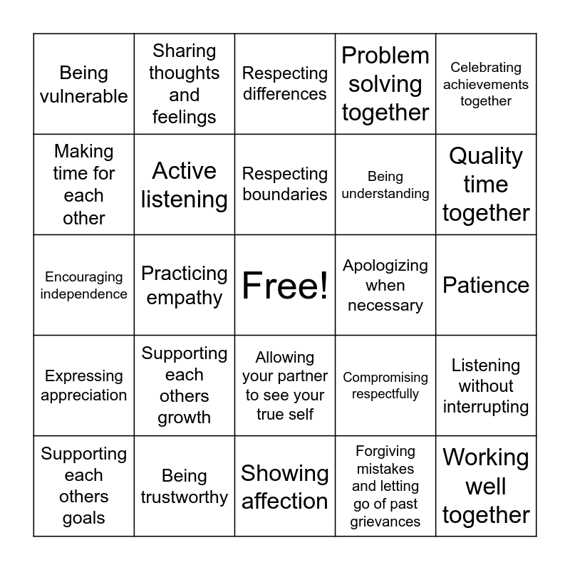 This bingo card has a free space and 36 words: lifting each other up, respecting each other’s boundaries, sharing experiences, Active listening, Compromising respectfully, Expressing appreciation, Respecting boundaries, Non-judgmental support, Celebrating achievements together, Open and honest communication, Practicing empathy, Problem solving together, Managing conflict respectfully, Apologizing when necessary, Quality time together, Being vulnerable, Trustworthy, Supporting each others growth, Working well together, Respecting differences, Patience, Listening without interrupting, Being trustworthy, Supporting each others goals, Showing affection, Sharing thoughts and feelings, Encouraging independence, Keeping promises, Being understanding, Making time for each other, Being kind, Ensuring that your words show understanding and care, Forgiving mistakes and letting go of past grievances, Allowing your partner to see your true self, Offering support through both good and bad times and learning from each other.